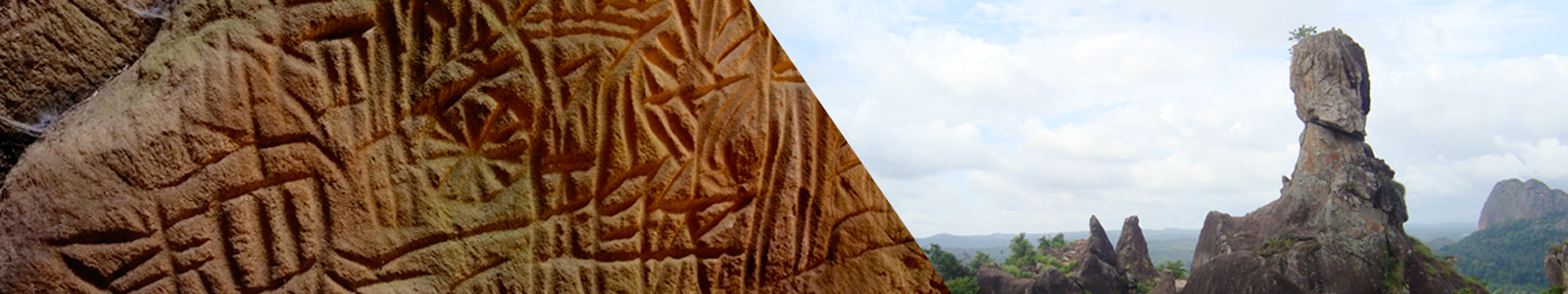 These are not technically caves, but rather a cleft, rift or rock shelter approximately 96 ft (29 m) by 22 ft (6.7 m), a 30-foot-deep (9.1 m) fissure caused by a piece of rock splitting away from the main body. On one side of the cleft is a rock weighing several tons that covers the cleft to form the 'roof' of the cave. The carvings are of human and animal figures, tools used by humans and of symbols yet to be deciphered, suggesting the presence of a prehistoric settlement.